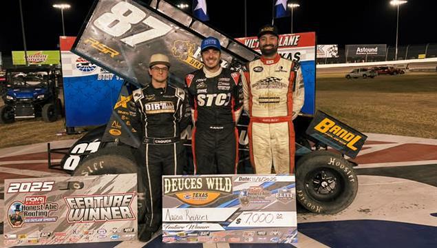 Contesting closely behind would find Brenham Crouch recovering late to place on the final podium spot. Ian Madsen would be among the frontrunners, all feature to fourth as Joe B Miller moved past eight other drivers to round out the top-five finishers for the POWRi Honest Abe Roofing 410 Outlaw Sprint League, running in conjunction with the POWRi Elite Outlaw Sprint Series presented by MYCO Plastics, in Night Two of the Deuces Wild Championship Weekend at Texas Motor Speedway Dirt Track.