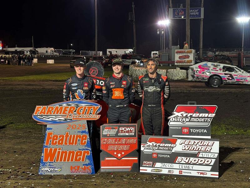 Farmer City, IL. (4/11/25) Jacob Denney would lead twenty-one of Farmer City Raceway twenty-five feature laps to earn his fifth career feature win with the POWRi National Midget League, running in conjunction with Xtreme Outlaw Midget Series presented by Toyota, on Friday night after a thrilling midget main event in support of the Illini 100 Night One.