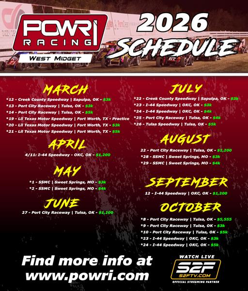The 2026 season features a mix of iconic venues and competitive dates, including multiple stand-alone appearances at Port City Raceway and I-44 Speedway, in addition to events run in conjunction with the POWRi National Midget League at Creek County Speedway, Tulsa Speedway, Sweet Springs Motorsports Complex, and Lil’ Texas Motor Speedway.