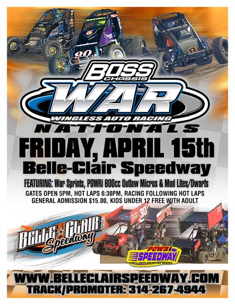 Belleville, IL – The Speedway Motors POWRi 600cc Outlaw Micro Series will kick off their 2016 tour on Friday, April 15th at Belle-Clair Speedway. Also in attendance alongside the POWRi Micros, the BOSS Chassis WAR non-wing sprint car series will be making non-wing sprint car racing’s debut at the high-banked 1/5th mile.