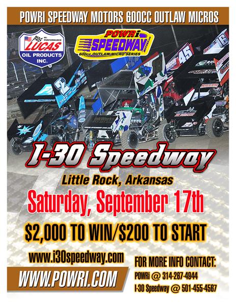 Belleville, IL – This Saturday, the POWRi Lucas Oil West Midget Series and the POWRi Speedway Motors 600c Outlaw Micro Series invade I-30 Speedway in Little Rock, Arkansas. Paying $2000 to win and $200 to start, the event will be directed and run by POWRi officials with the typical POWRi format for a POWRi Speedway Motors 600cc Outlaw Micro Series show. The POWRi West Midget Series will be racing for $1500 to win and $150 to start.