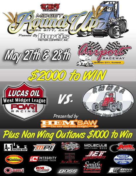 Tulsa, OK (May 16, 2017) Last year on Labor Day weekend, TBJ Promotions brought together the Lucas Oil POWRi West Midget League presented by HE&M Saw and the Rocky Mountain Midget Racing Association for the inaugural Midget Round Up at Airport Raceway in Garden City, Kansas. After a weekend of great racing, it was quickly decided that the two would meet up again in 2017; but changing it up to Memorial Day weekend. As the month of May moves forward, in less than two weeks, the best midgets in the West will once again meet up at the racy Airport Speedway.