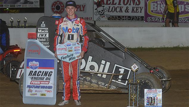 Eldon, Mo (06/13/2020) Buddy Kofoid of Penngrove, California charges from his 22nd starting position to clinch the POWRi Lucas Oil National Midget League Win. Kofoid stayed consistent with the top line through the traffic to add his name to the win list at Lake Ozark Speedway.